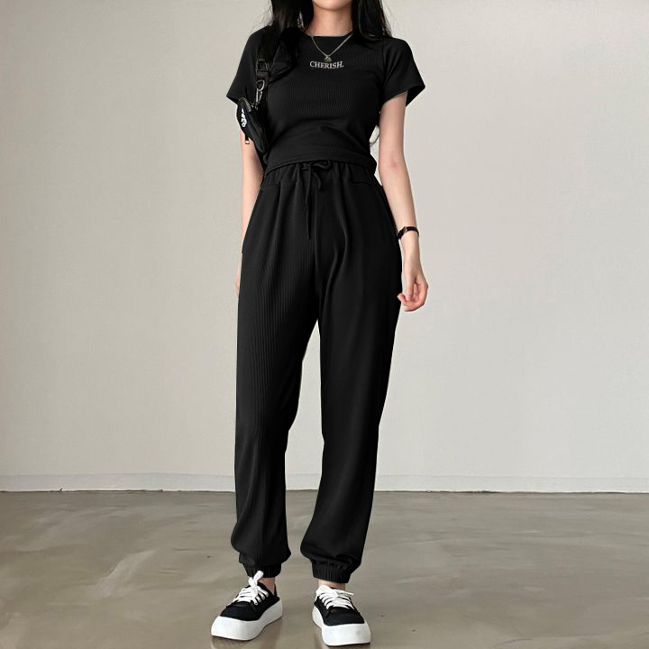 黑色韩版两件套装女加大码棉夏季外贸休闲运动服短...