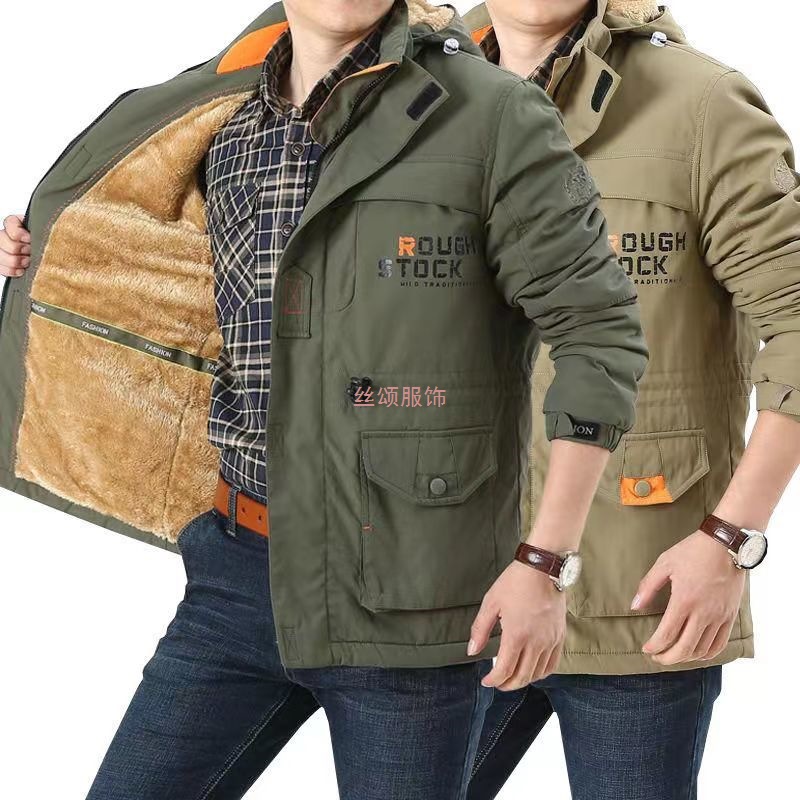 冬季加绒加厚多口袋工装棉衣男士大码宽松户外登山...