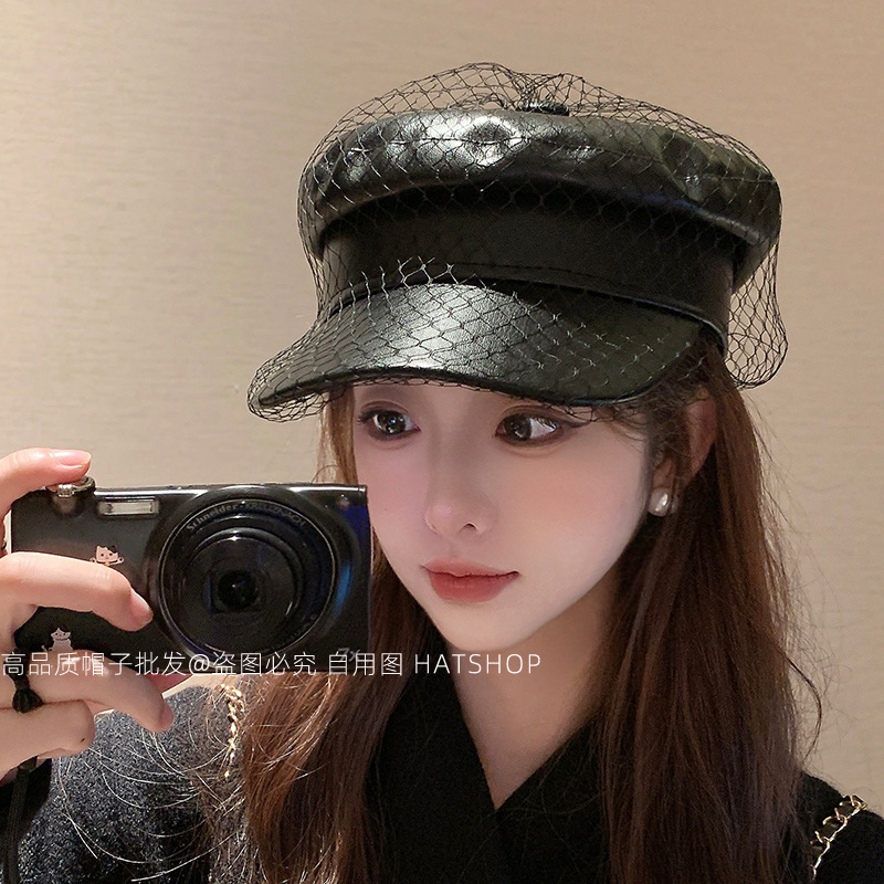 皮质网纱马术帽子女秋冬气质优雅名媛礼帽贝雷帽