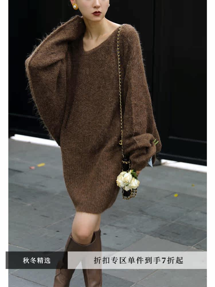 Mogas时髦气质亲肤慵懒风休闲宽松V领套头马海毛针...