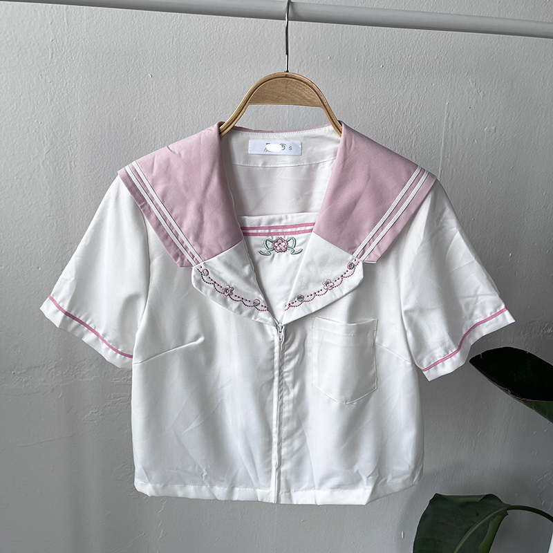 夏城yi西缘单 软妹白色拼接粉色领海军领水手服短袖...