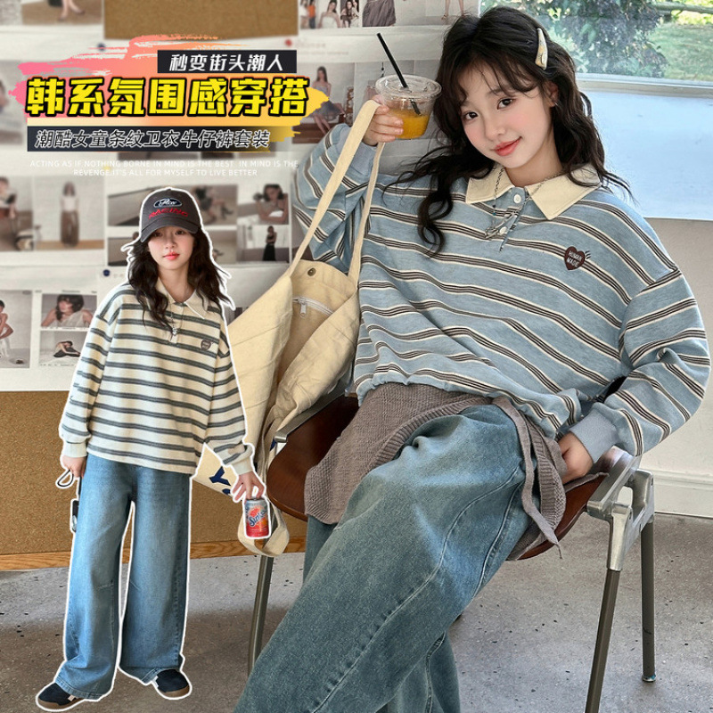 女童春秋款条纹polo衫卫衣套装2026新款女大童洋气...