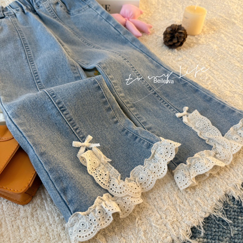 时尚春季新款女童牛仔裤春款蕾丝花边微喇裤洋气百...