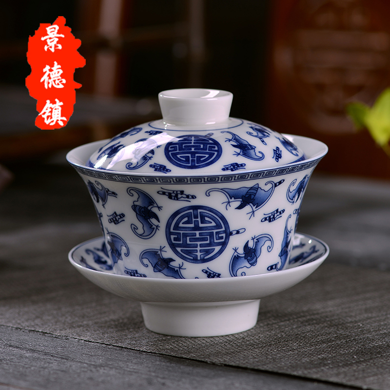 陶瓷盖碗茶杯茶碗大号景德镇青花瓷薄胎泡茶碗三才...