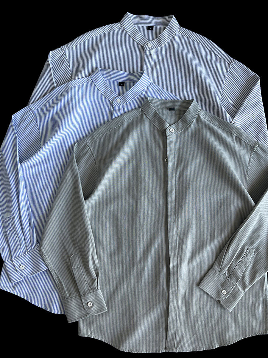 质感纯棉日单春秋复古亨利领长袖条纹衬衫男通勤轻...