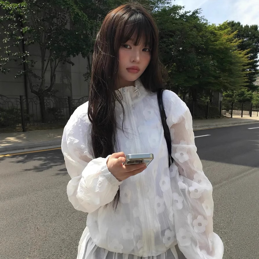 2色入 韩国夏季花朵提花透视拉链防晒衫外套凉爽日...