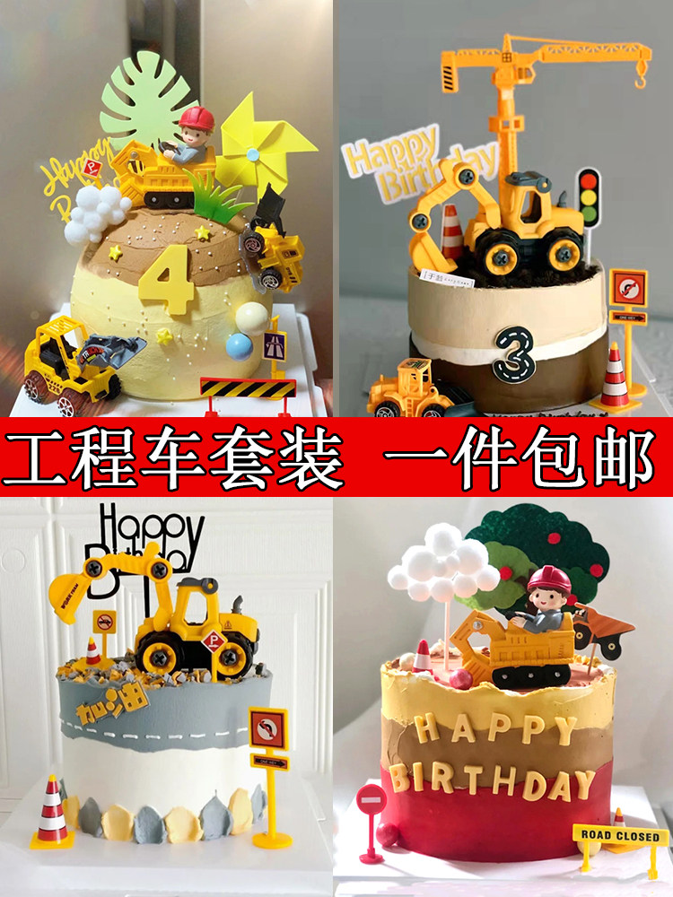 儿童生日蛋糕装饰男孩工程车挖土机推土机路障摆件...