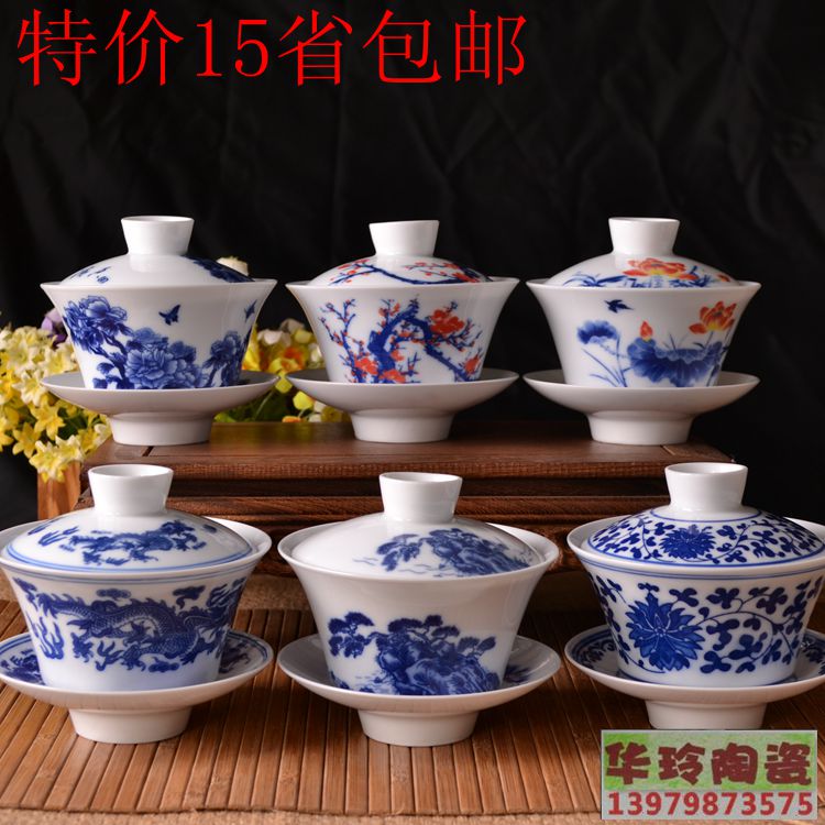 中式茶杯 景德镇青花瓷缠枝莲 三才碗 茶碗 马蹄饭...