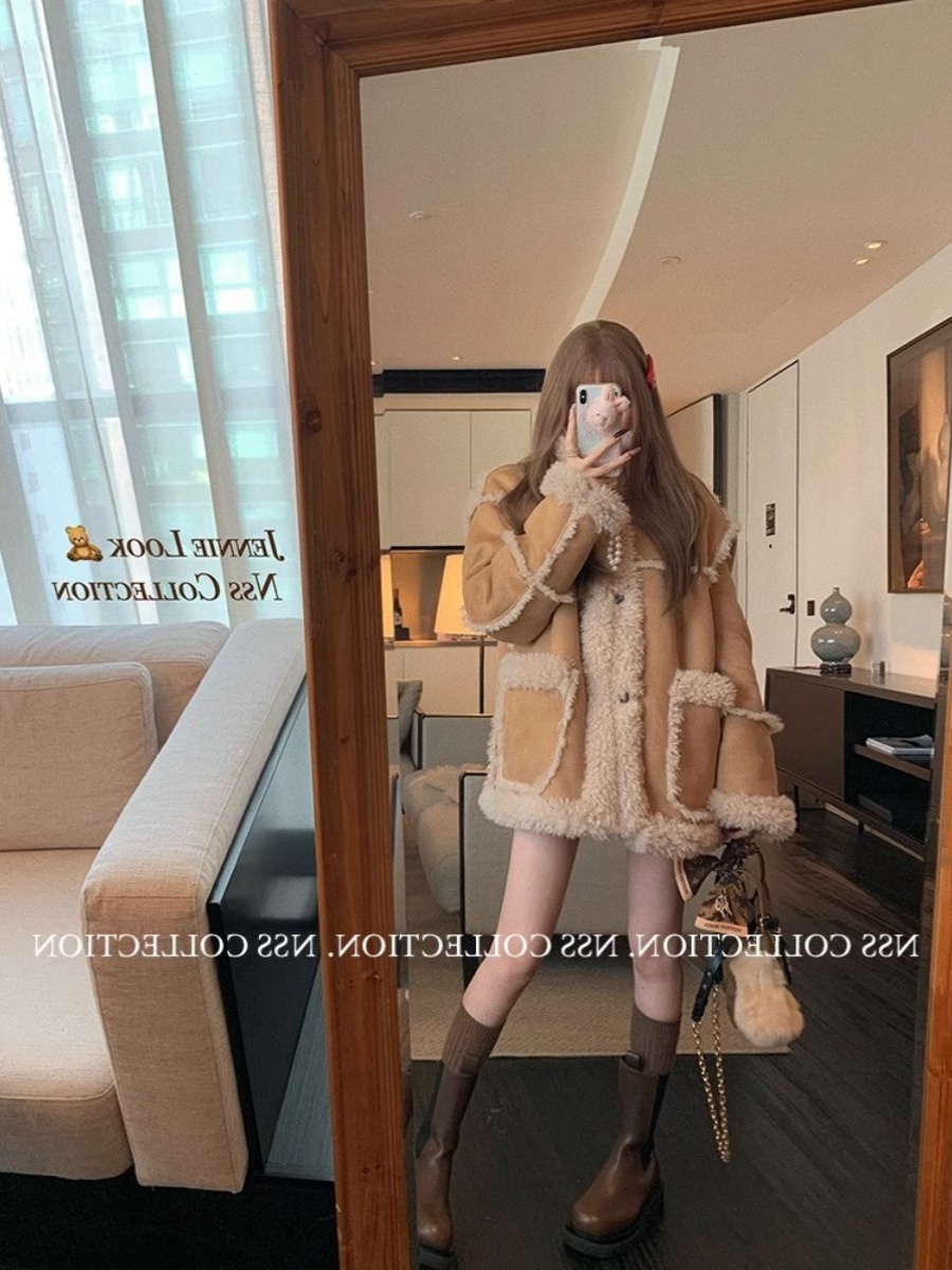 秋冬新款卡其拼接羊羔毛长袖上衣女高级感皮毛一体...