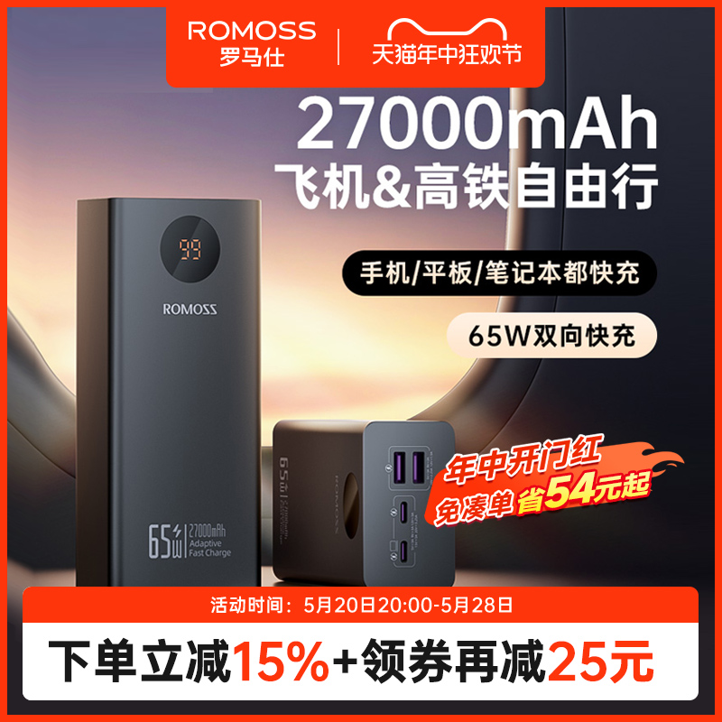 罗马仕充电宝27000毫安超大容量65W双向快充超级快...