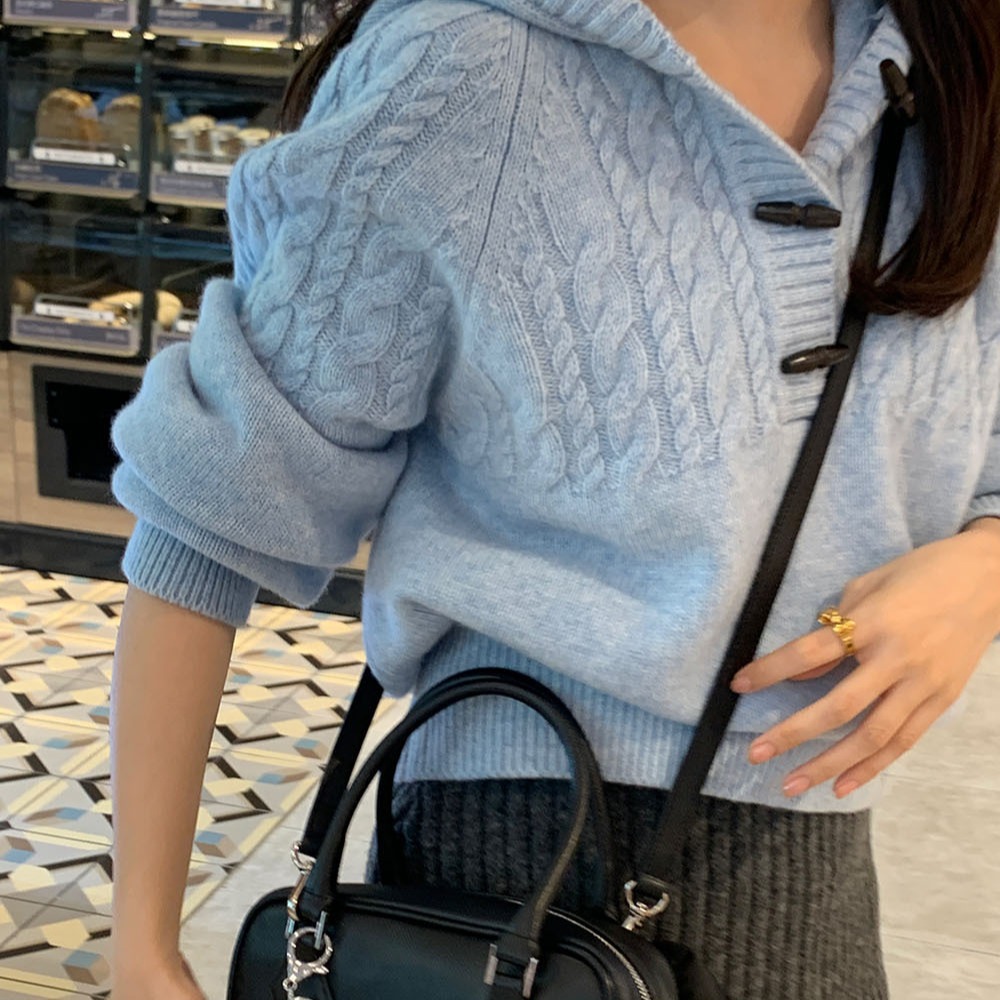 实拍秋冬韩系慵懒ins风 三粒牛角扣连帽羊绒麻花针...