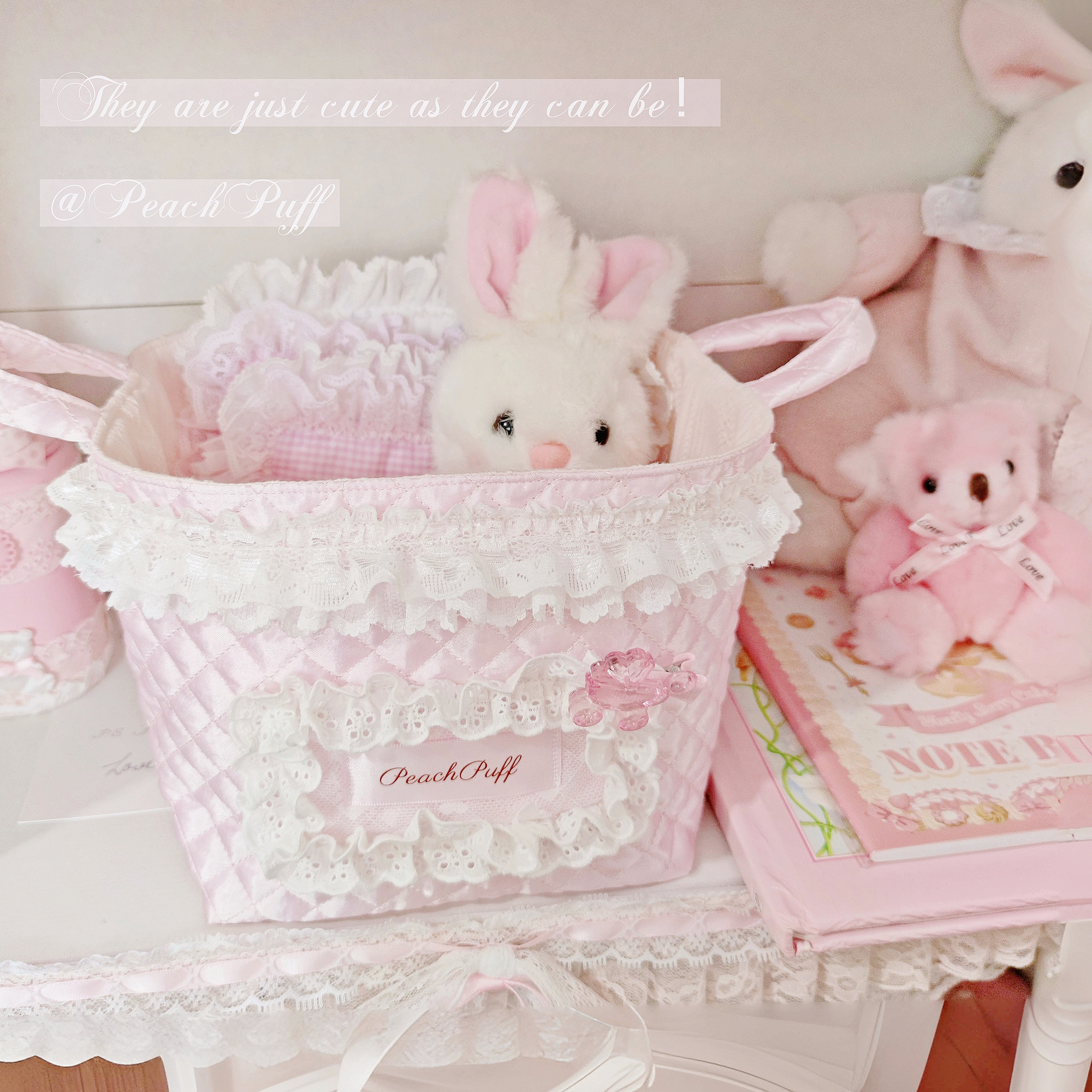PeachPuff 浅粉格子绗棉蕾丝花边兔兔收纳筐可爱居...