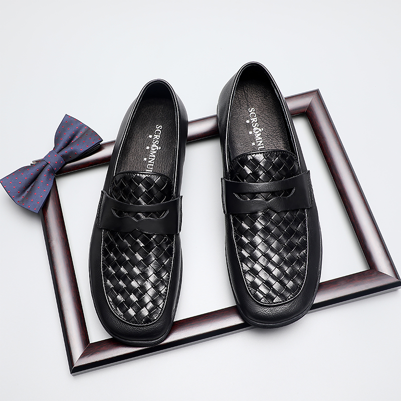 莫卡辛鞋男手工编织商务休闲男鞋软底真皮一脚蹬豆...
