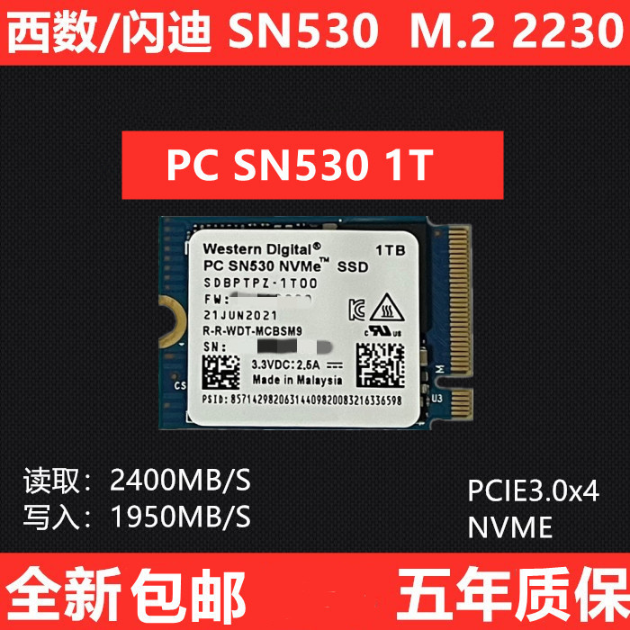 WD西数PC SN530 1T M.2 2230 NVME PCIE 笔记本固态...