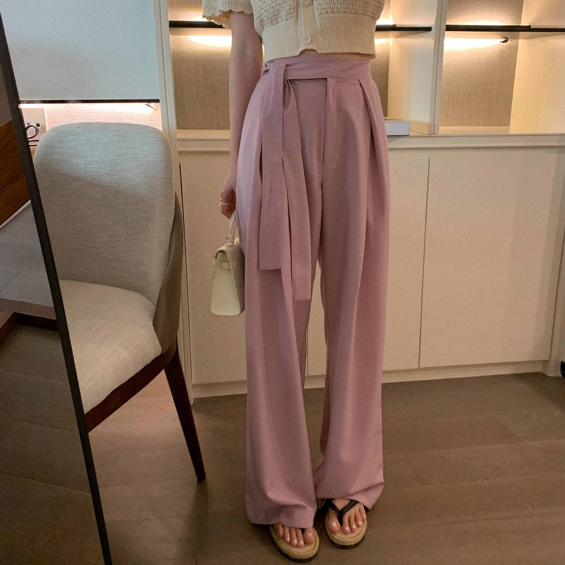 飘带设计感高腰直筒西装阔腿裤垂坠感长裤/薄款雪纺...