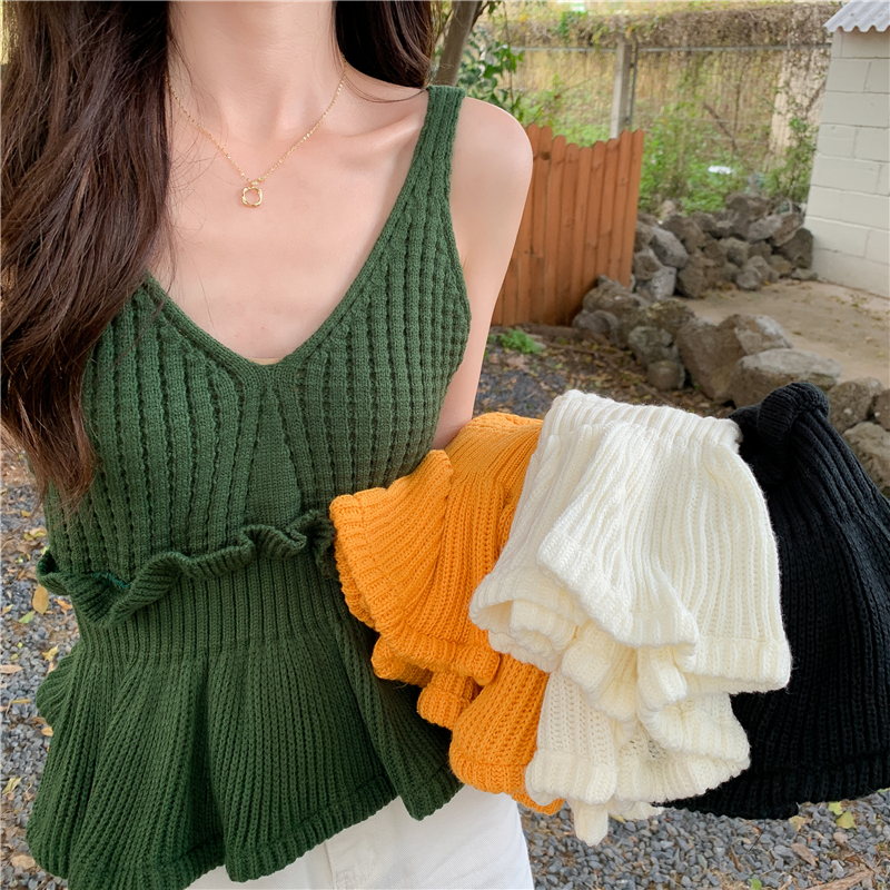 大码女装胖MM木耳边显瘦荷叶边针织吊带上衣夏新款...