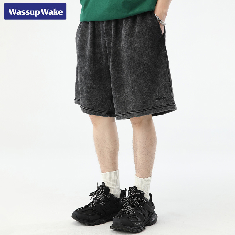 wassup wake美式短裤男潮牌ins夏季复古做旧宽松休...