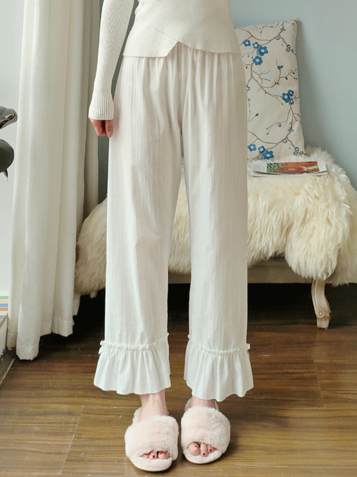 春季纯棉薄款纯色喇叭裤睡裤女甜美荷叶边下摆宽松...