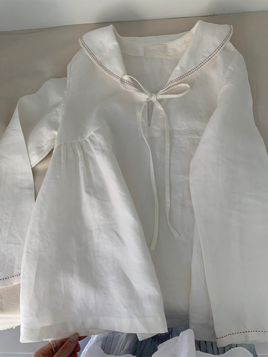 CHAO级推荐!海军领亚麻白色衬衫女小众设计感气质...