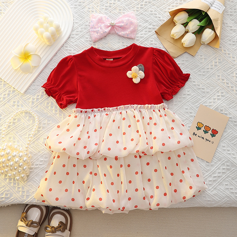 女童夏季连衣裙洋气泡泡袖圆领韩版圆点印花拼接纱...