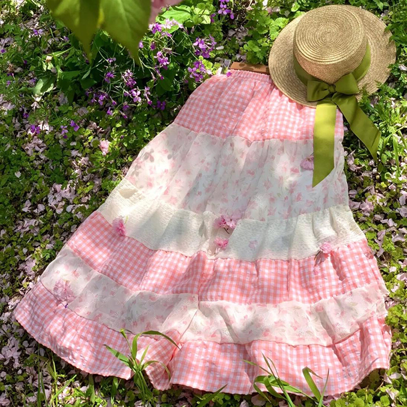 设计感小众粉拼白格子半身裙女2024夏季新款别致甜...