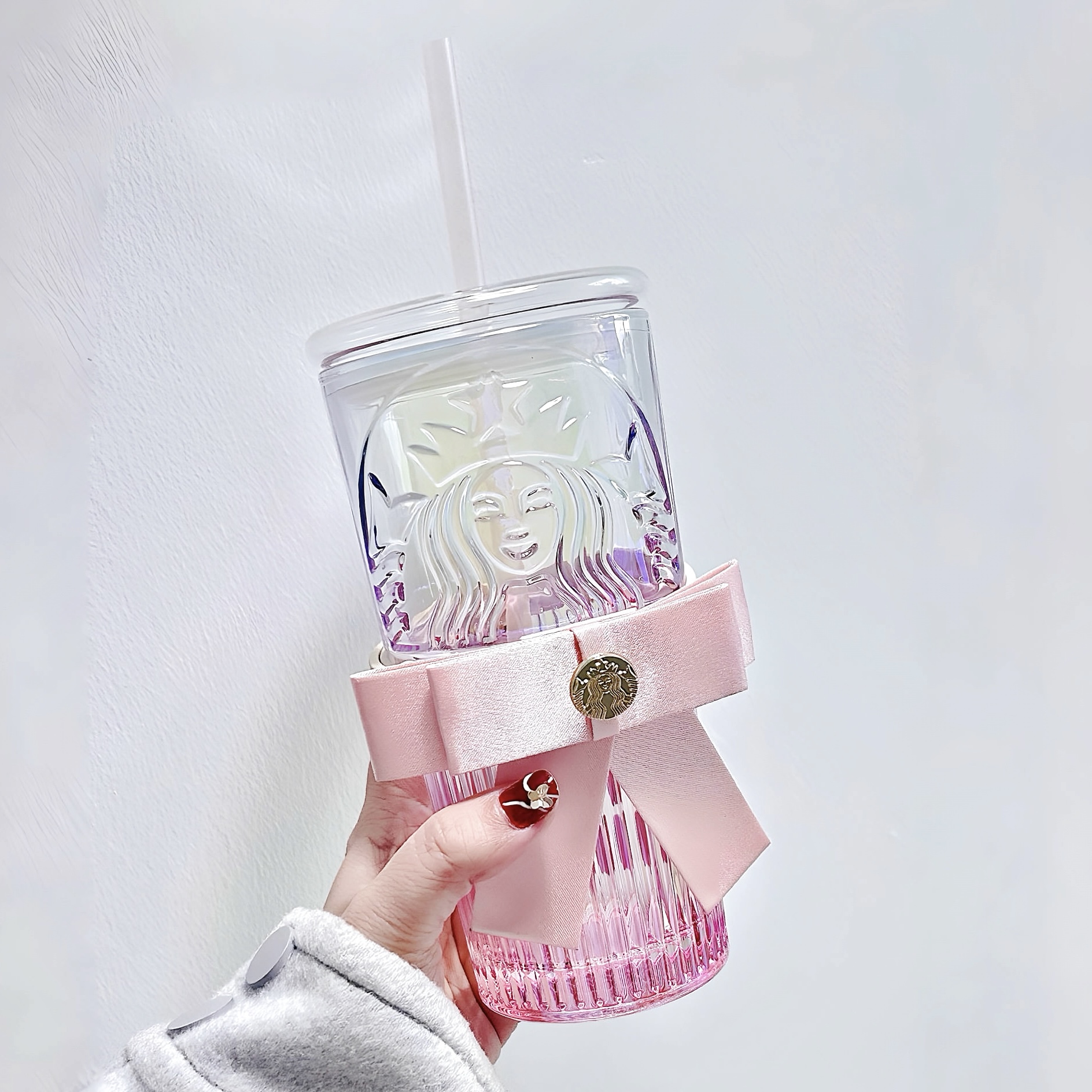 星巴克杯子粉色渐变蝴蝶结女神玻璃吸管杯大容量水...