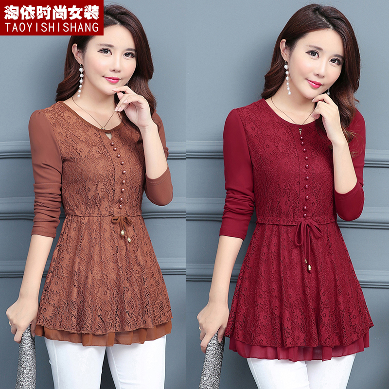2023春秋新款圆领系带收腰遮肚显瘦蕾丝衫长袖宽松...