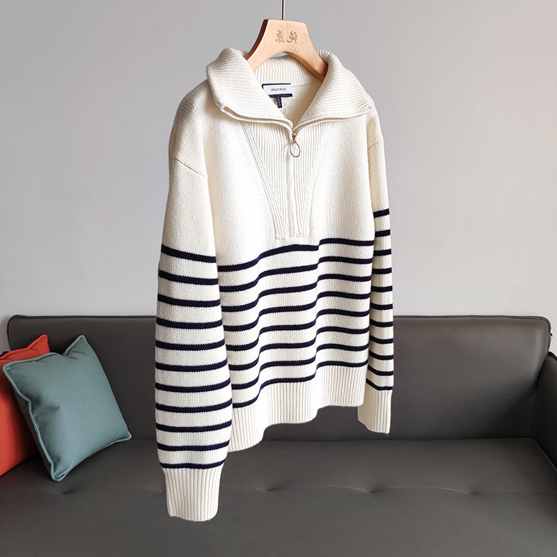 捡漏专柜撤回~ 黑白撞色条纹羊绒宽松半半拉链长袖...