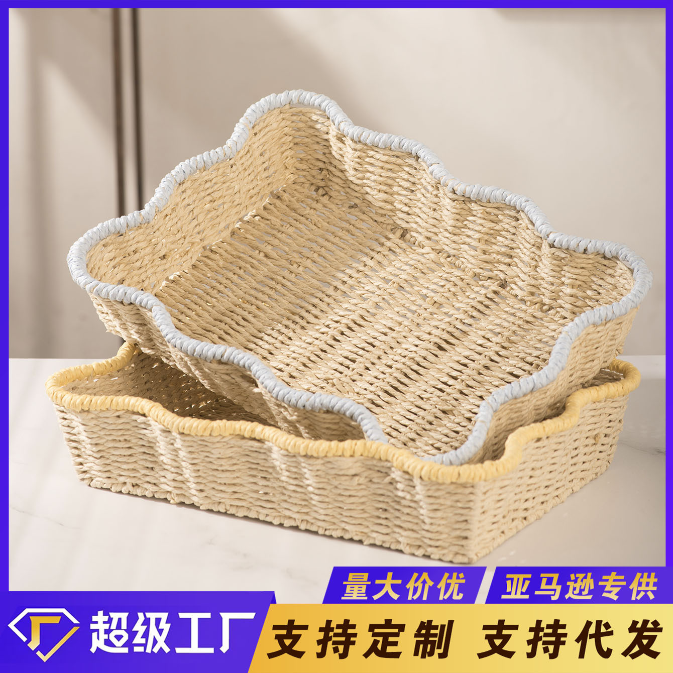 手工编织纸绳收纳篮仿藤家用置物篮客厅零食托盘桌...