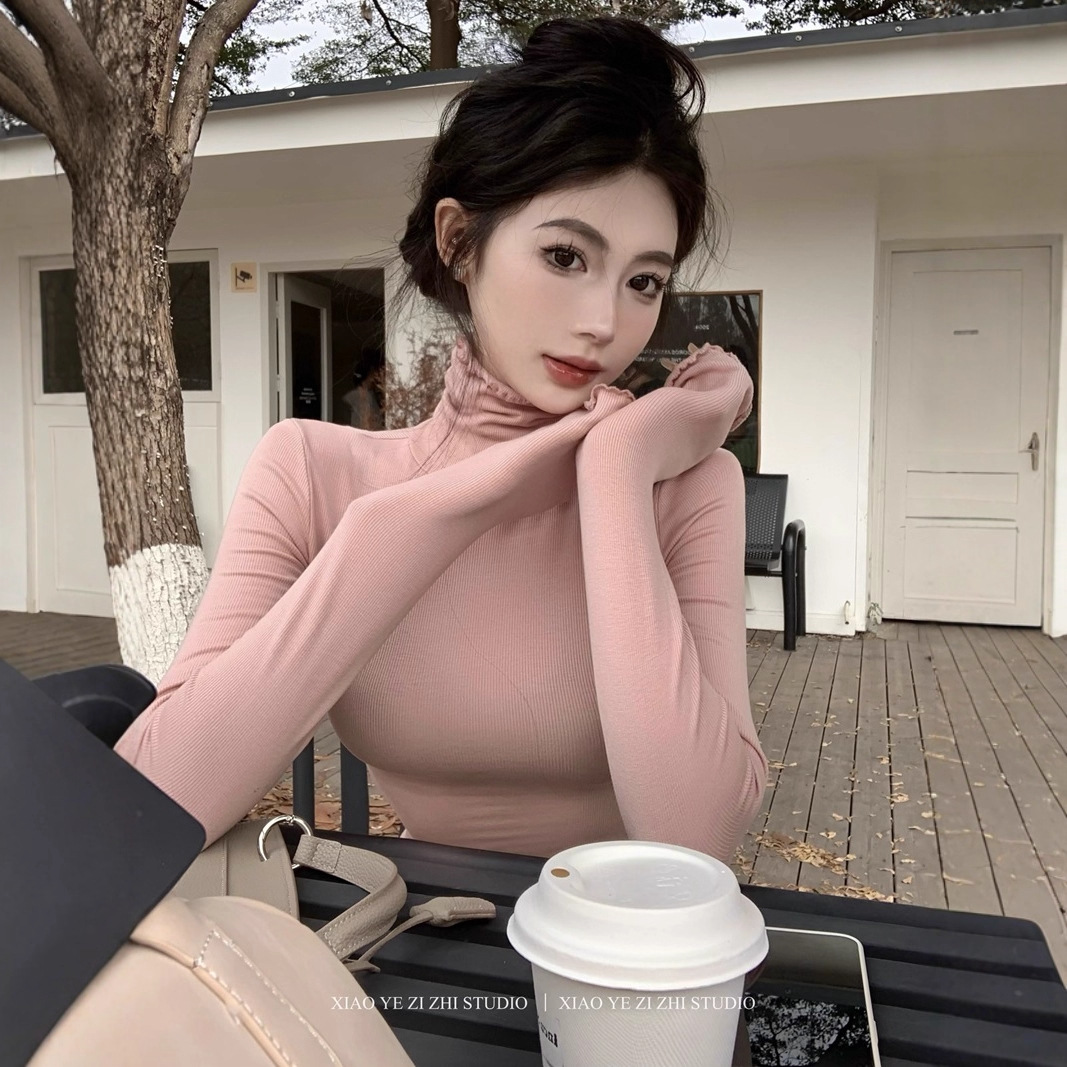 实拍2025秋冬新款基础款百搭木耳边修身弹力显瘦加...
