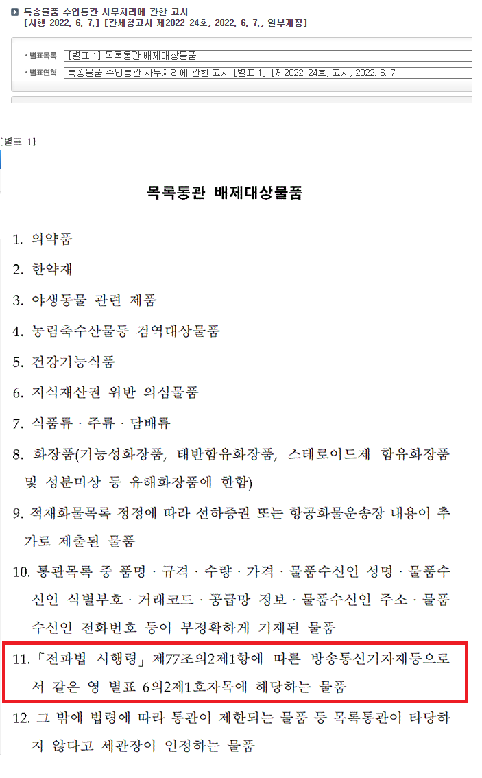그 동안 개인의 자가소비 목적으로 수입할 경우 목록통관이 가능했던 전자제품, 통신기기 등의 전파법 대상 상품들이