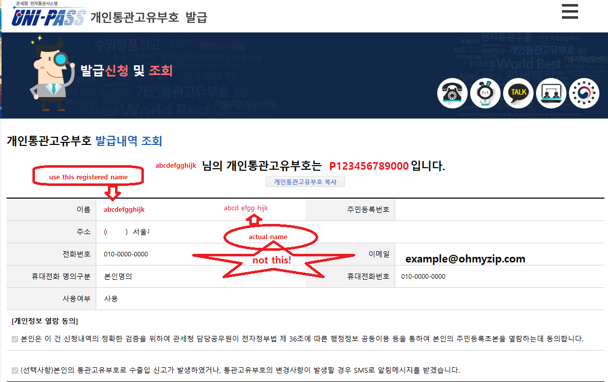 특히 외국인이실 경우 개인통관고유부호 발급은 이름, 성의 중간에 삽입된 띄어쓰기가 없이 유니패스 시스템에 저장되고 있는 경우가 많기 때문에
