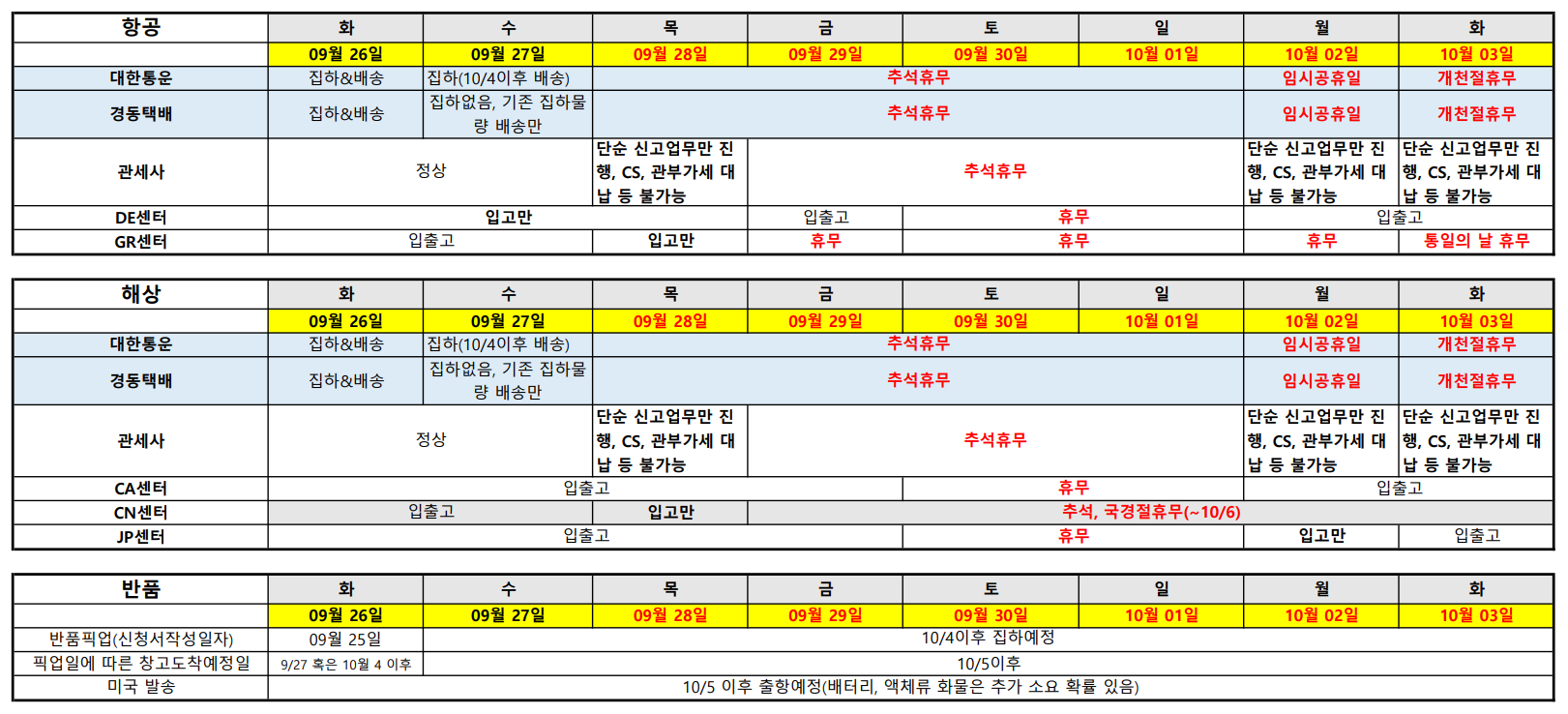 휴무가 아니더라도 한국 통관으로 인하여 현지 출고가 진행되지 않을 수 있으니 상세 일정은 첨부해드린 표를 참고해 주시기 바랍니다.