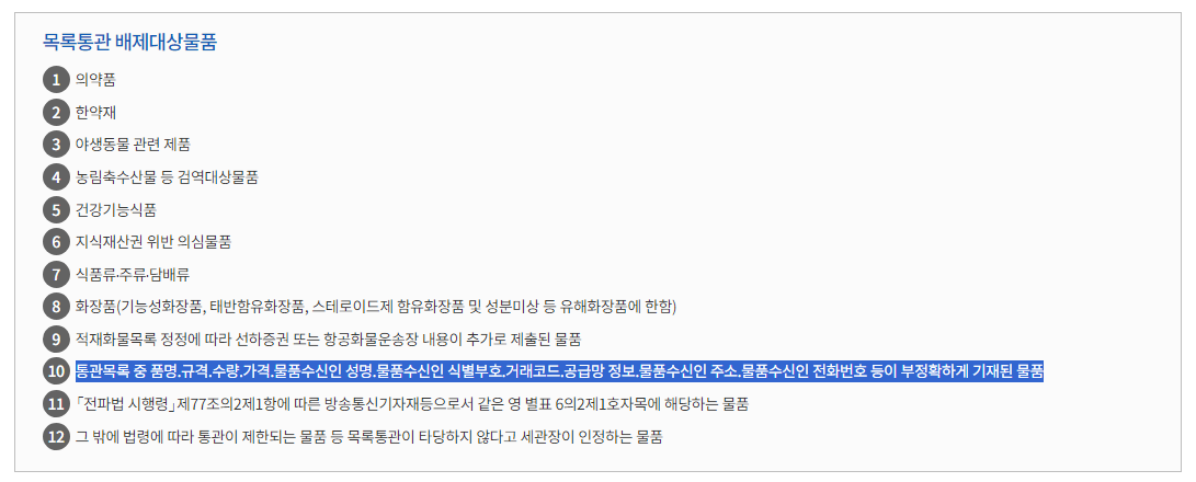 그럼에도 불구하고 간혹 오류건들이 발생하고 있으며 이는 관세청 목록통관 배제대상물품에 해당함을 알려드립니다.