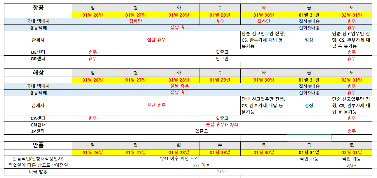 휴무일에는 입고, 출고 및 고객센터 업무가 모두 진행되지 않는 점 알려드립니다.