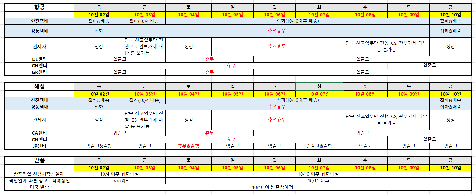 휴무가 아니더라도 한국 통관으로 인하여 현지 출고가 진행되지 않을 수 있으니 상세 일정은 첨부해 드린 표를 참고해 주시기 바랍니다.